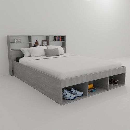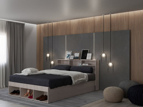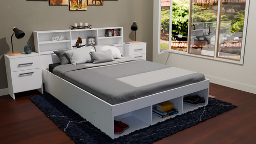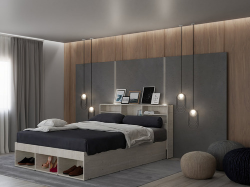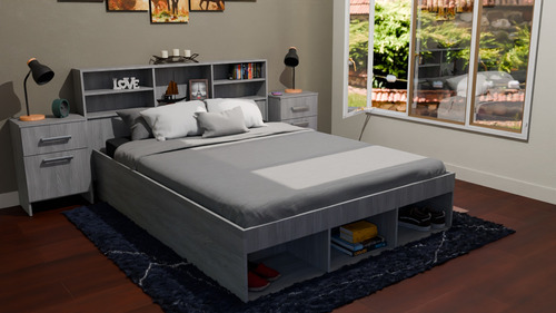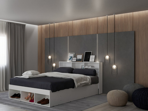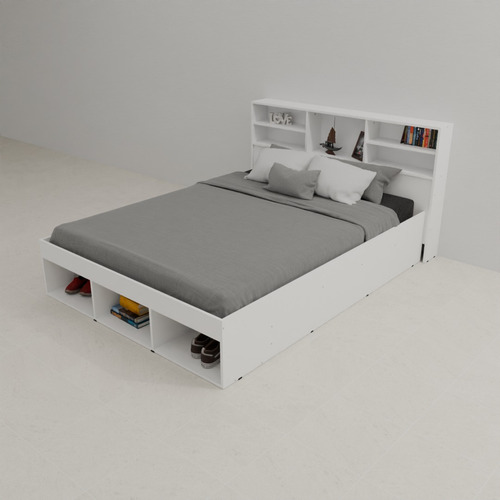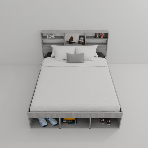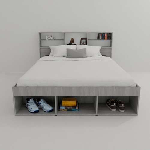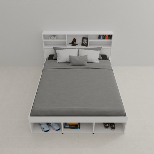 Posee un respaldo con cinco estantes y tres box zapateros en la piecera, que permiten mantener el ambiente de la habitación ordenado y elegante.