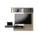 El panel central cuenta con varillado moderno y detalles en tonos de madera, que también sirve para organizar los cables del TV, manteniendo un aspecto limpio y minimalista.